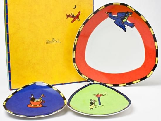 <ローゼンタール> ●1879年、フィリップ・ローゼンタールがドイツ南部バイエルン州のエアカースロイト城に絵付け工房を開いたのがローゼンタールの始まりです。 1891年良質の磁器を求めてゼルプに工場を移し、歴史と伝統に支えられたマイスターの技と近代的な生産設備により、ドイツを代表する磁器メーカーへと成長しました。 ローゼンタールは、モダンスタイルを発信する“スタジオライン”、ヨーロピアン・エレガンスを今日に伝える“クラシック”、カジュアルライン“トーマス”、洗練されたトラディショナル“フッチェンロイター”などのブランドを展開し、時代をリードし続けています。 <ラブストーリー> ●1996年、ドロシーハフナーデザインによる「FlashLoveStory」シリーズです。ベルリンのデザイナー キティカハンによって世界中を旅する男女のイラストがポップなタッチで可愛らしく描かれています。 KittyKahane(キティ・カハーン)デザイン。夢の国のカップルをポップな色使いでロマンティックに描いた「ラブストーリー」。出会いから世界一周旅行へと旅立つ、恋人たちの物語がテーブルの上に広がります。 箱付き。 サイズ:直径 ブルー 約16.5cm グリーン 約16.5cm レッド 約27cm ![]()