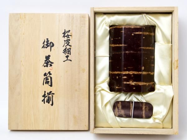 ・箱に少々ヨゴレあります サイズ: 茶筒 口径8.4cm 高さ 12.4cm 茶味 口径7.3cm 高さ 3cm <樺細工由来> 命名の由来は諸説あり、定説があるわけではなく、古代にはヤマザクラを樺や樺桜と呼ばれるようなことがあったためという説や、樺の名前は家を建てるための木材である白樺からきており、樺は実際の工芸ではなく職人の種類を示すために使われていると言う説が有あります。 秋田の角館の佐竹北家によって秋田県北部の阿仁地方から角館に技法が伝えられたとされ、藩政時代は下級武士の副収入源となっていました。18世紀末から始まっており伝統は200年を超えるとされます。これが、地域の職人の工房を通じて現代まで伝わり武士の町であった角館工芸協同組合の美術館は樺細工の工芸品を常設展示しています。 <工法> 主に型ものと木地ものの2種類で桜の皮は剥ぎ取られた後、乾燥された後に汚れを落とされ、小型の滑らかで均一になるように処理されます。型ものの場合、仕上たい型に桜皮をあわせ、膠で貼り付けて固めた後に中に入れていた型を取り外して作られます。木地ものは利用する形に切られた木に、膠を使って再度加工した桜の皮が貼り付けられ、貼り付け工程では火で熱せられた小さな金ゴテが使われます。すべての面で別々の形の樹皮が必要とされるため、非常に手間のかかる作業です。 現在では特定の用途だけではなく様々なものに対して使われて、時には大型の木工アートワークとして利用され、時計、小箱、筆、刀の鞘などが生産されております。 <利用> 伝統的な樺細工は一般的に小さなものが多く、印籠や胴乱といったものに使われることが多かったのです。現在では茶筒や煙草入れなどに使われて、樺細工にはこれらの乾燥した物の湿度を一定に保ち、外部からの変化から守る特徴があります。色は元となる樹皮や膠により、一般的に暗い赤色をしております。 ![]()